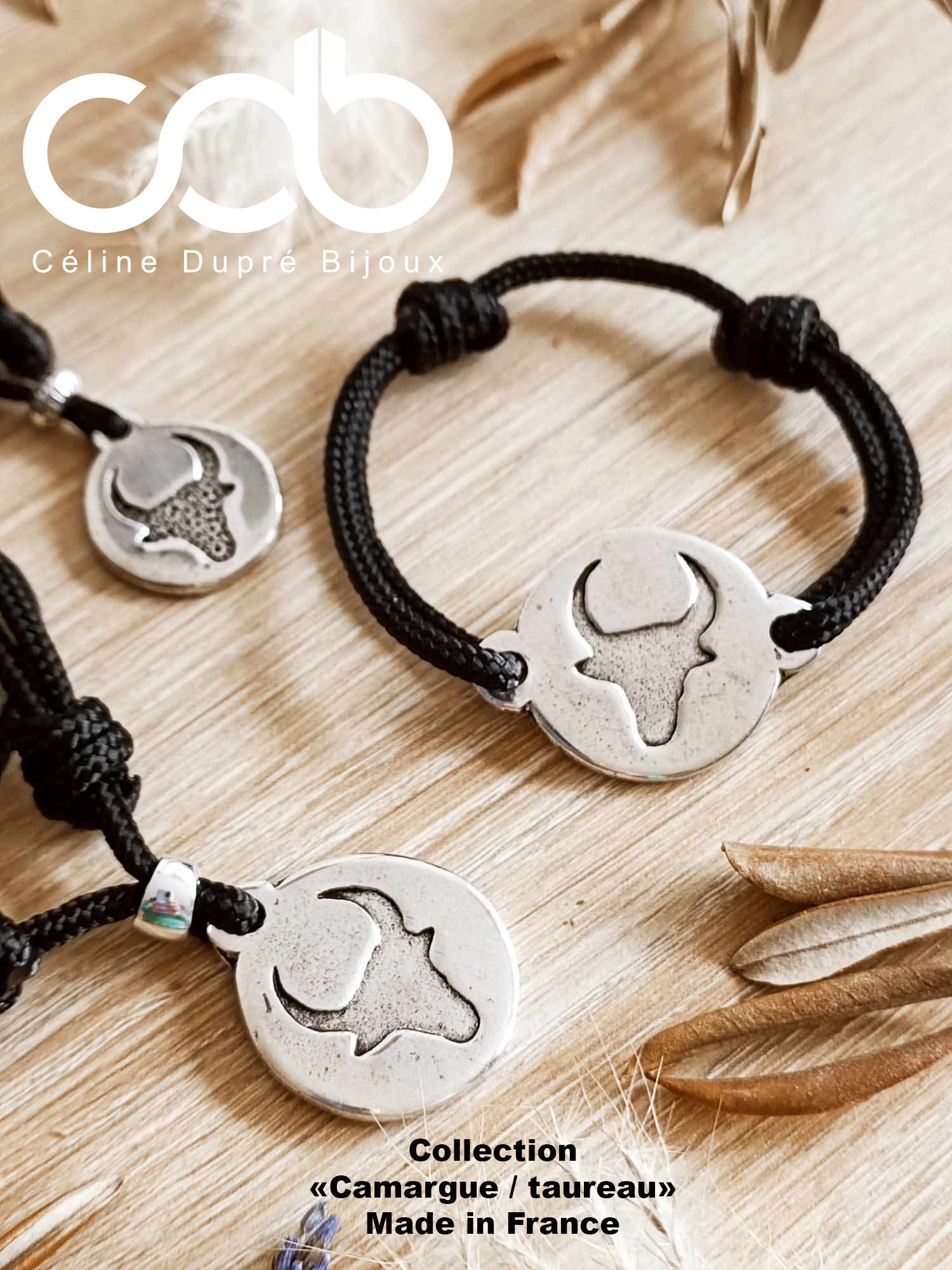 Bracelet composed of a 10 micron silver-finish tinplate medal, mounted on an adjustable cord using sliding knots.